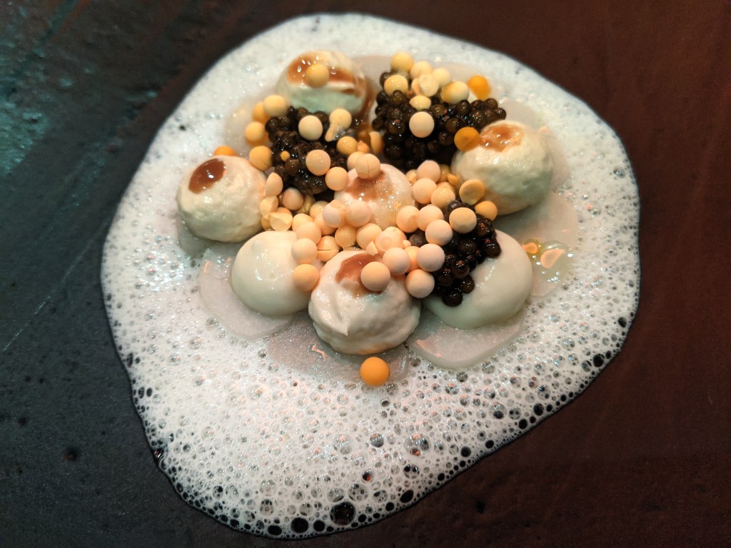 Scallops, fresh Rey Silo cheese, nitrogen-frozen egg-yolk, caviar
