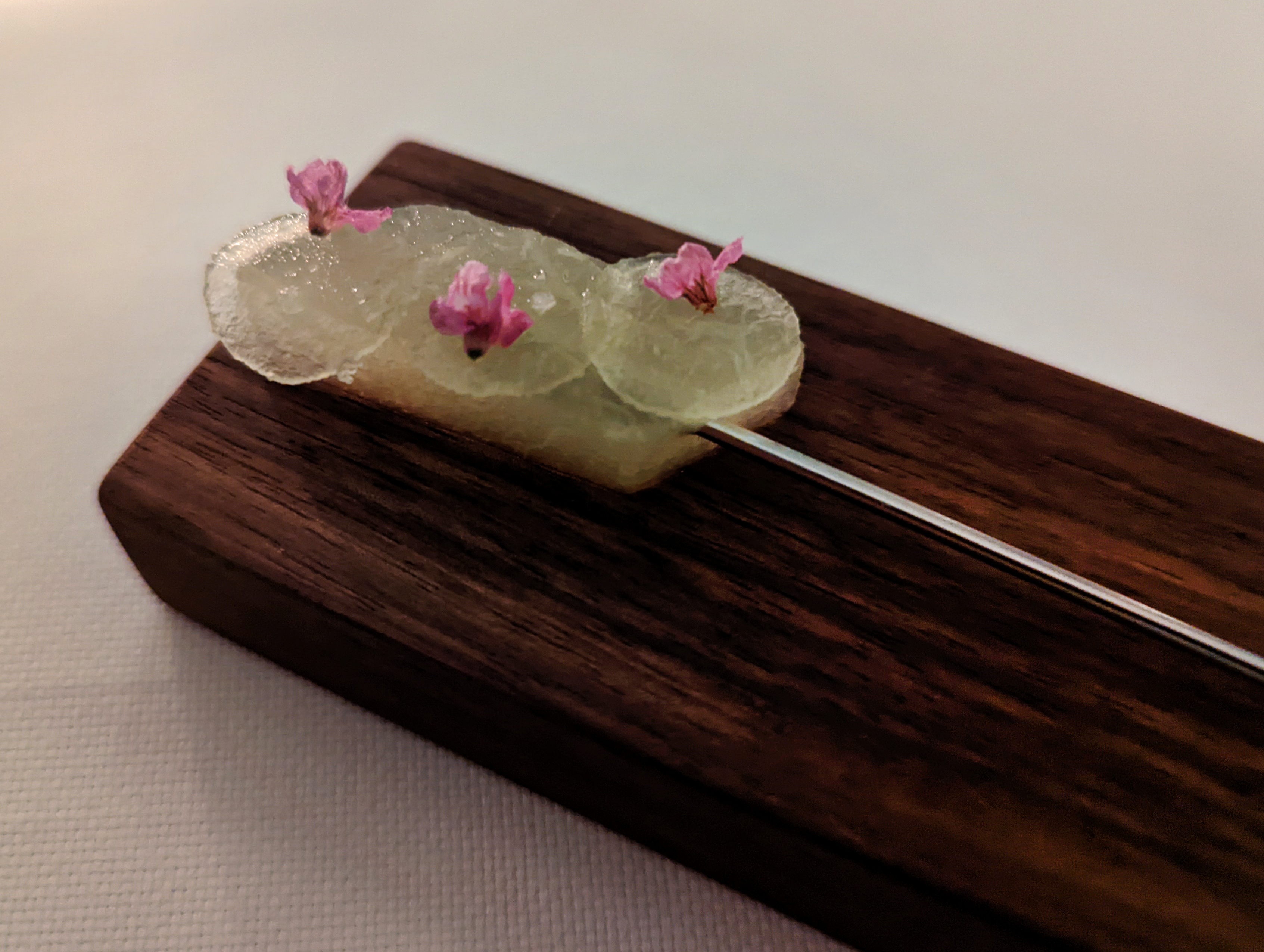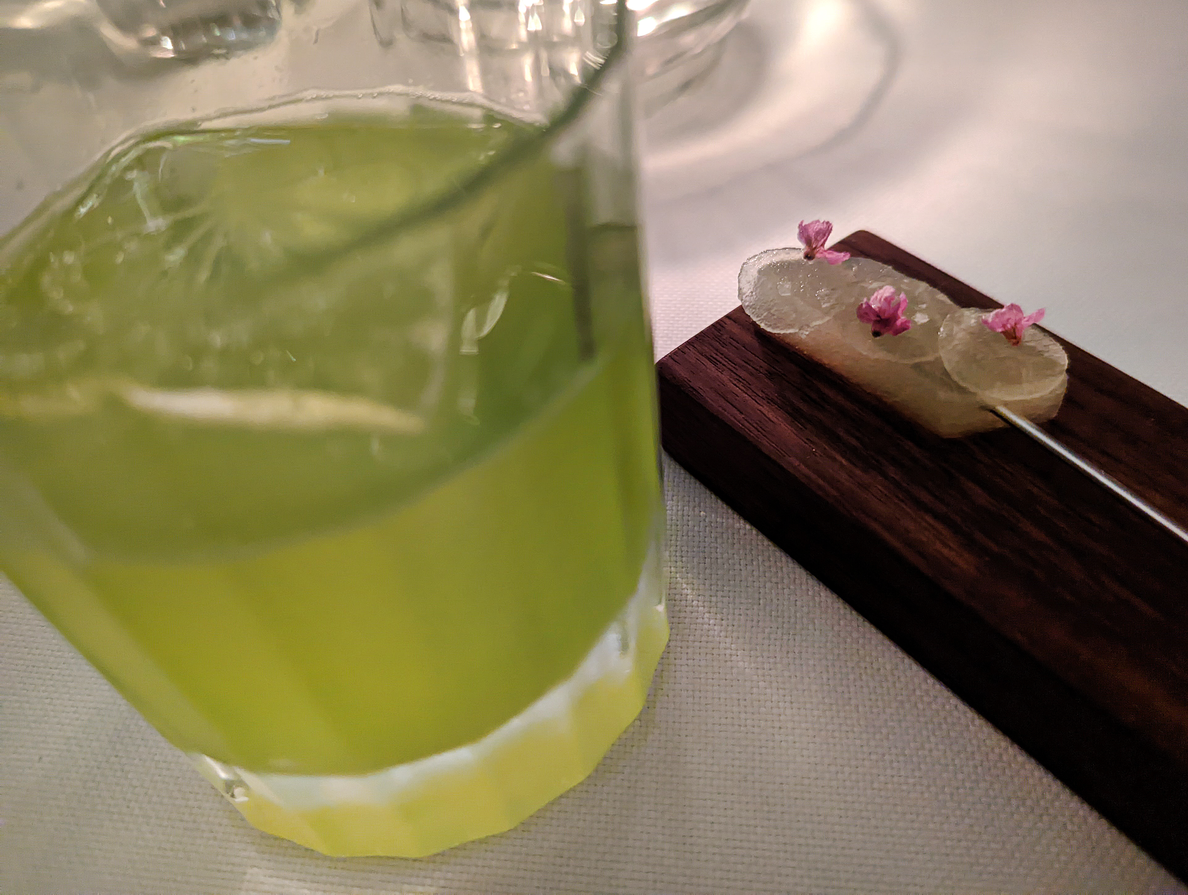 “Morning Dew” – A welcome cocktail, a cava and melon sphere that pops in your mouth.