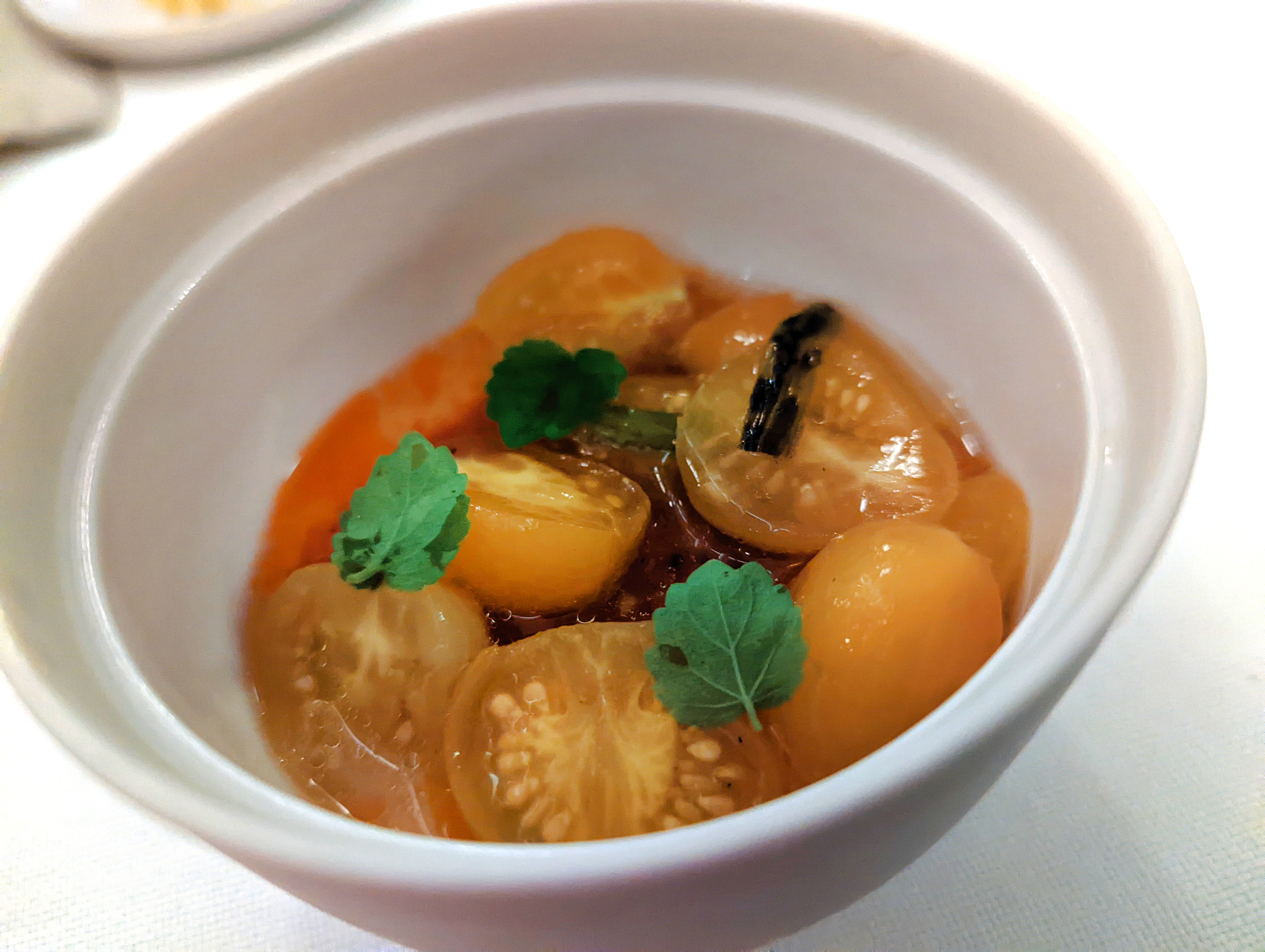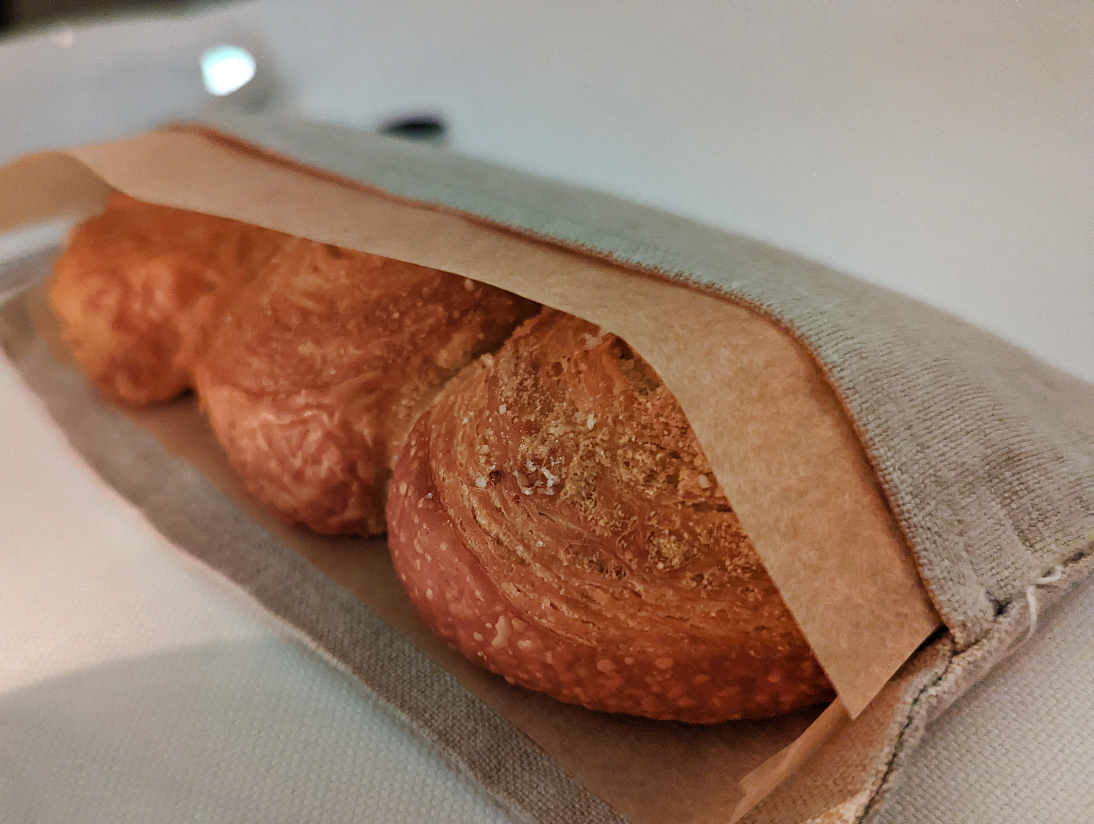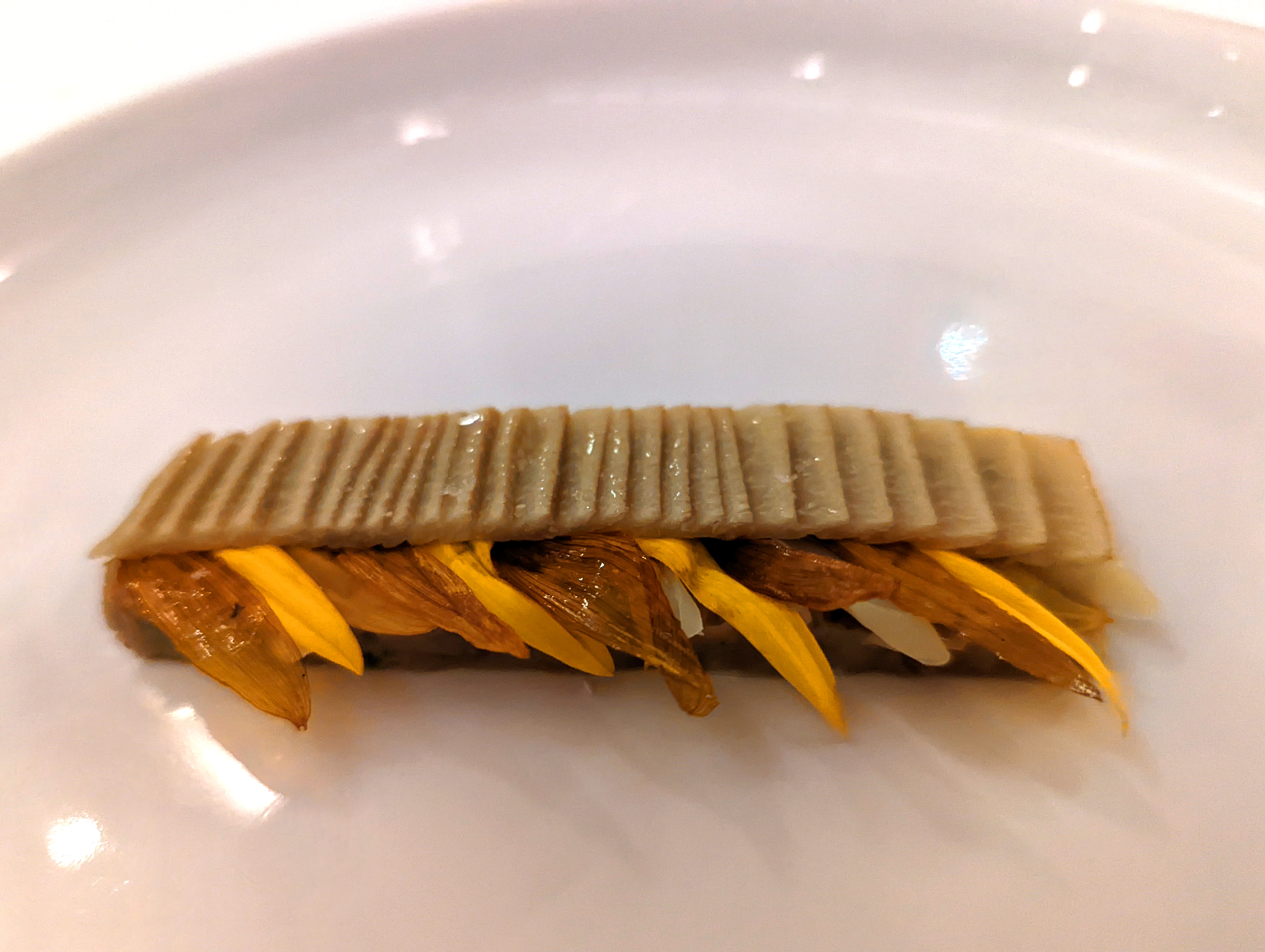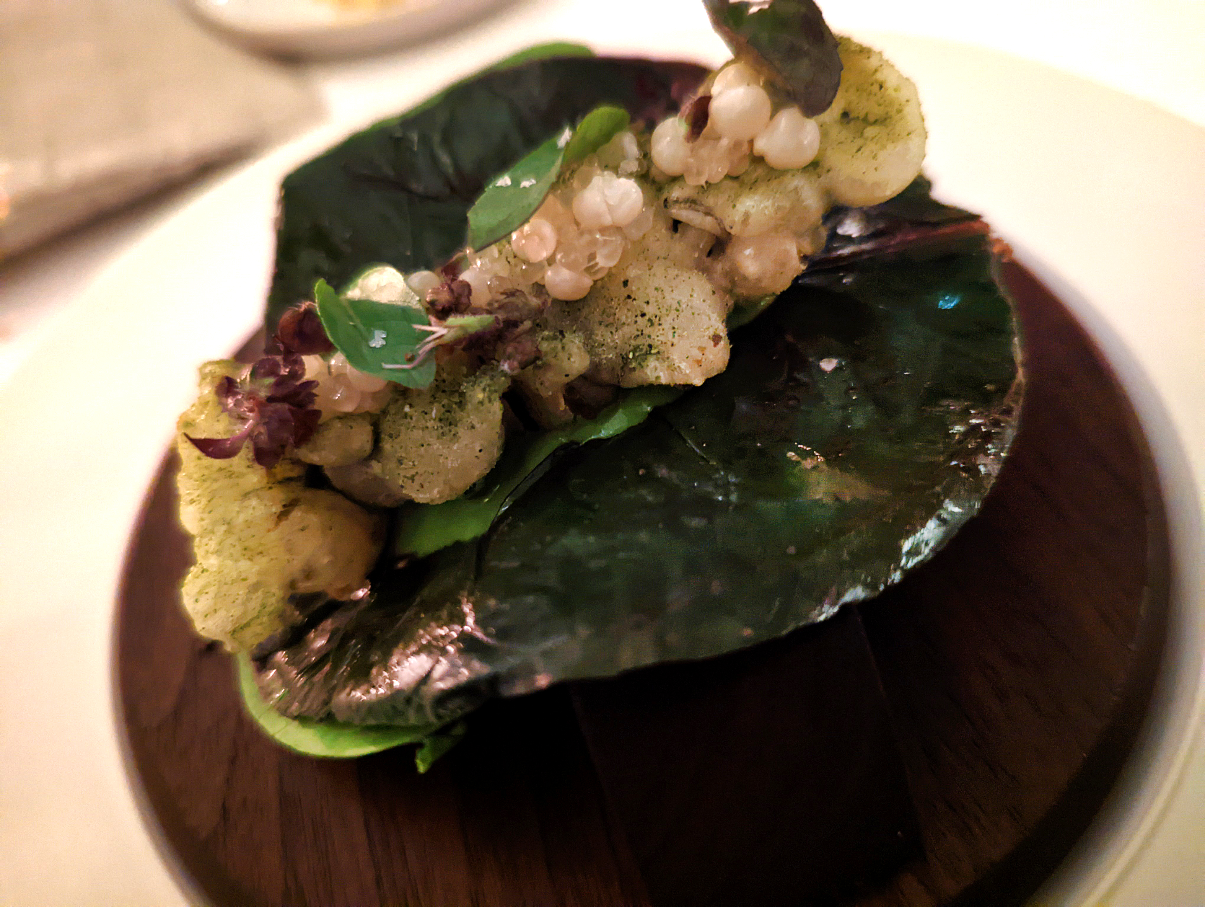 Mikey and I were joined by Michael Oliver to experience 11 Madison Park’s all-plant menu. Overall, the meal was quite tasty, maybe lacking a bit on the “wow,” rich, umami flavors I’m usually after in a tasting menu, but very beautiful, thoughtful and unique. Personal highlights were a buttery vegan croissant along with the best vegan butter I’ve ever had. I really enjoyed the dumpling on one of the first celtuce courses, the mushrooms gave it a very powerful punch and the dumpling skin was perfectly delicate. The corn and the tomato tofu dish were also rich and delightful.