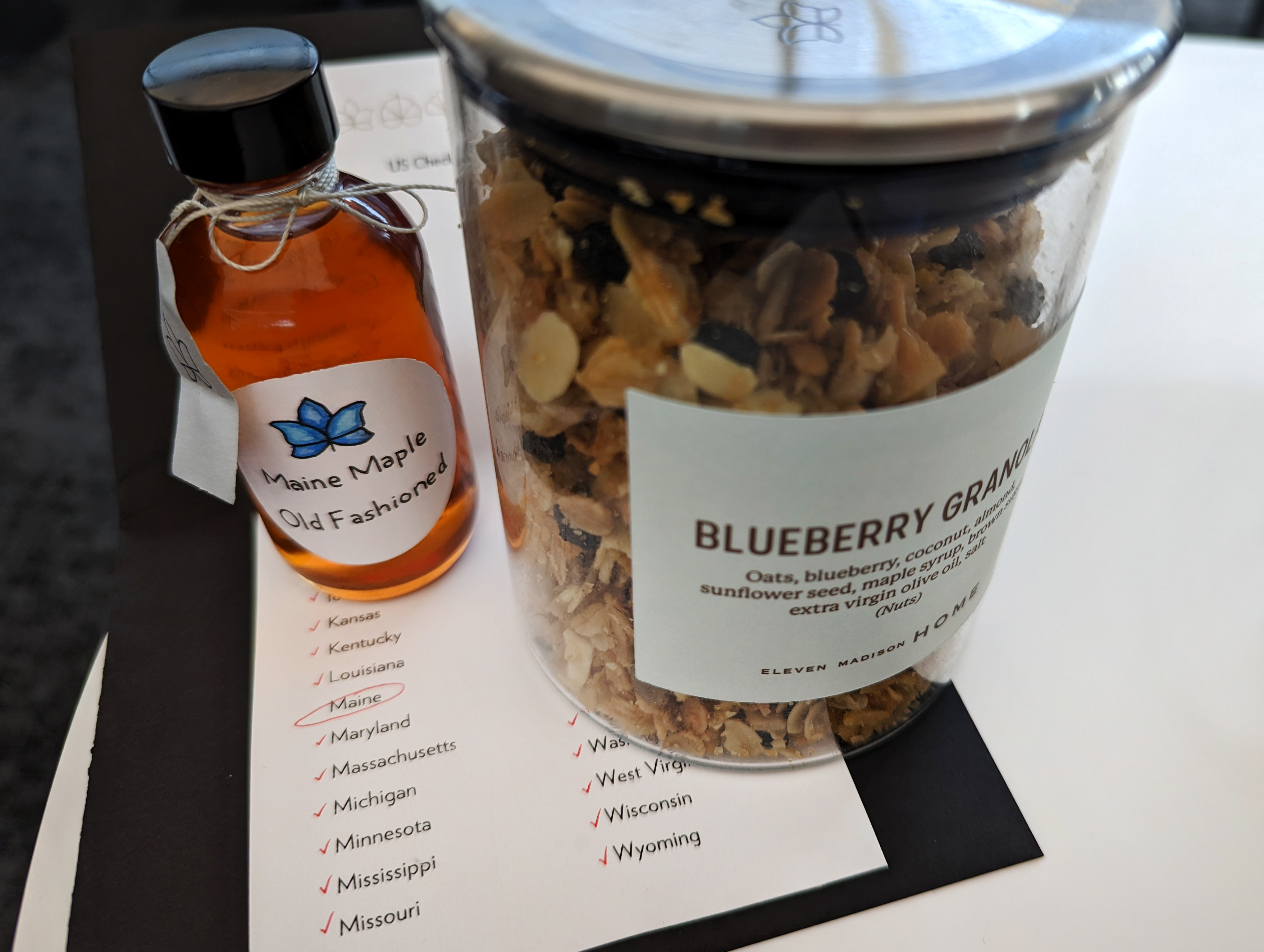 But the most amazing detail came after the meal. Early in the meal we talked with our server about Maine, mentioning that it’s the only state to which I’ve never been. At the end of the meal, a member of our service team delivered a beautifully composed document – on the front, all states checked off save for Maine. On the back, 10 restaurant recommendatinos and a list of fun sites to visit when I get there. The note was paired with a container of granola (that I snacked on in the morning) and a neatly-labeled bottle containing a Maine maple syrup old-fashioned. That ending note took the “really good” assessment of the night to a “great.” Photos of the meal below!